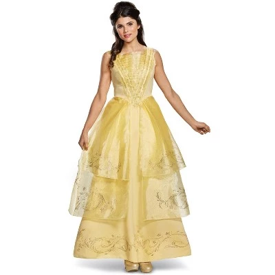 As inspired by the live-action Beauty and the Beast, Belle’s signature yellow ball gown features a square neckline, a glittery bodice and features gold swirls and flowers along the bottom. In this costume, you’ll be ready to tell your tale as old as time.