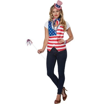 Looking to accessorize this 4th of July? Make your friends jealous with our Patriot Lady costume kit. The kit includes an American flag printed vest, stars and stripes printed mini hat and versitile scarf.