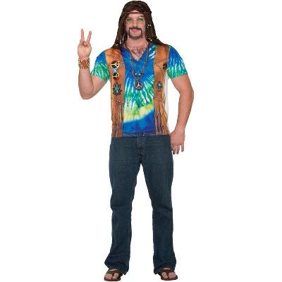 You’ll look like a far out psychedelic hippie dude in this cool 1960s shirt. This comfortable tee features printed details made to look like a full costume. This shirt features a printed tie dye pattern, a printed fringed vest with fake hippie patches, and even printed necklaces so you don’t have to buy extra accessories. This shirt has everything you need for your Woodstock event.