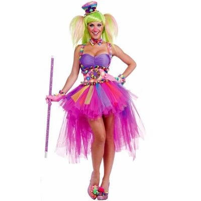 Get noticed and look your sexiest in the Women’s Sexy Tutu Lulu the Clown Costume. This costume includes a frilly fuchsia tulle tutu with multicolor sheer details that is short in the front and long in the back, an attached multicolor suspender belt with ruffle trim, a matching bow tie and a purple top. You can complete the outfit with our selection of related accessories like the Women’s Circus Sweetie Lollypop Lilly Wig, Nude Lycra Control Top Pantyhose, Clown Red Nose and Women’s Circus Sweetie Berry Bubbles Wig, sold separately on our website. Go alone or with friends dressed in any of our other clown costumes, easily found elsewhere on our website. Either way you will turn your next Halloween party into a sexy carnival when you wear this eye-catching outfit.