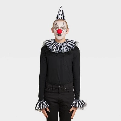 Style your own spin on a clown costume with the help of this Clown Halloween Costume Accessory Set from Hyde & EEK! Boutique™. These one-size clown accessories are easy to pair with clothing of your choice to create your own unique clown look. The set includes a pointy hat with pompom appliques, a ruffled collar, ruffled wrist cuffs and of course, a classic red round clown nose. Fabric hat, collar and cuffs all feature black and white stripes for a color palette that’s easy to pair with a variety of clothing.
