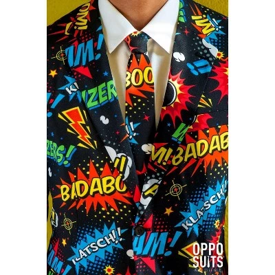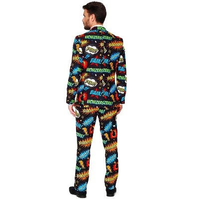 Burst onto the scene dressed in this hilarious, retro comic printed suit. This matching suit and tie combo features a variety of printed action bubbles in a medley of fun colors for a costume that is sure to save the day!