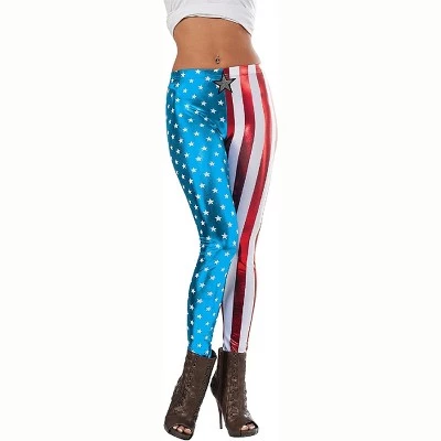 Add these stylish leggings to your Halloween costume this year. Perfect to wear to a party, for the Fourth of July, or to Trick or Treating. Features:Womens american dream leggingsLooks like the american flag Sizing Measurements: Women’s Size: Large/ Extra Large Length: 35 inchesInseam: 26 inches Material(s): polyester and spandex