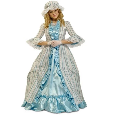 The Martha Washington Women’s Costume is an authentic looking period dress that looks like what a late 18th century colonial woman would wear. It’s floor length, flared, and features a blue satin under-dress and an attached printed over-dress. The matching bonnet is included, but the wig, gloves, glasses, and jewelry is not.