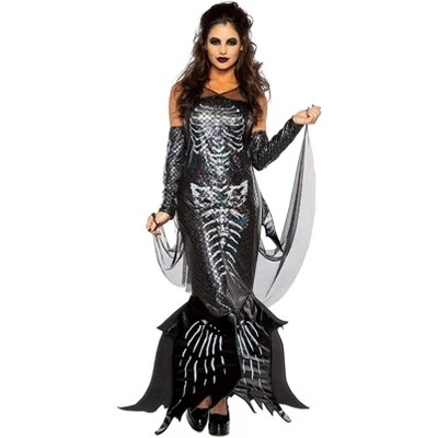 - DEAD AND LOVING IT: Beautiful shimmery black skeleton mermaid costume. Comes with dress, gloves, and shawl.